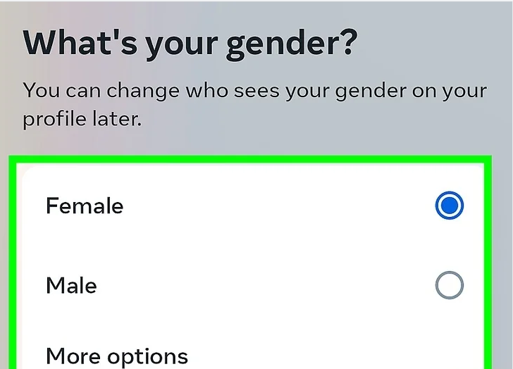 5.अपना लिंग चुनें। आप महिला, पुरुष और अन्य विकल्पों में से चुन सकते हैं।