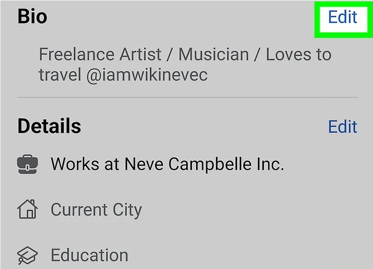 अपनी जानकारी संपादित करने के लिए “विवरण” के आगे “संपादित करें” पर टैप करें, फिर उन्हें निजीकृत करने के लिए प्रत्येक आइटम के आगे पेंसिल पर टैप करें। आप अपने वर्तमान स्थान, कार्य इतिहास, शिक्षा, गृहनगर, रिश्ते की स्थिति आदि के बारे में जानकारी जोड़ सकते हैं।